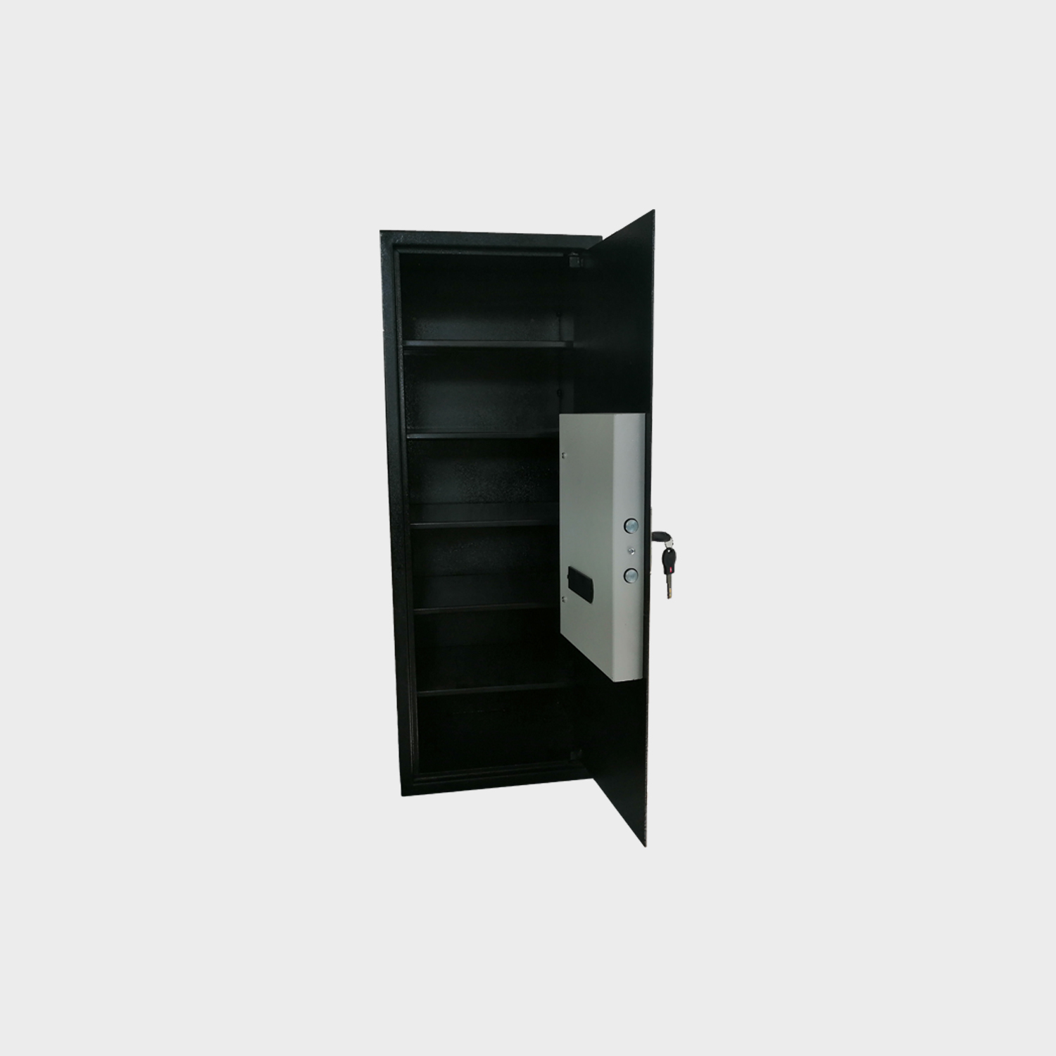 Ouverture et fermeture par serrure à clé et combinaison électronique.